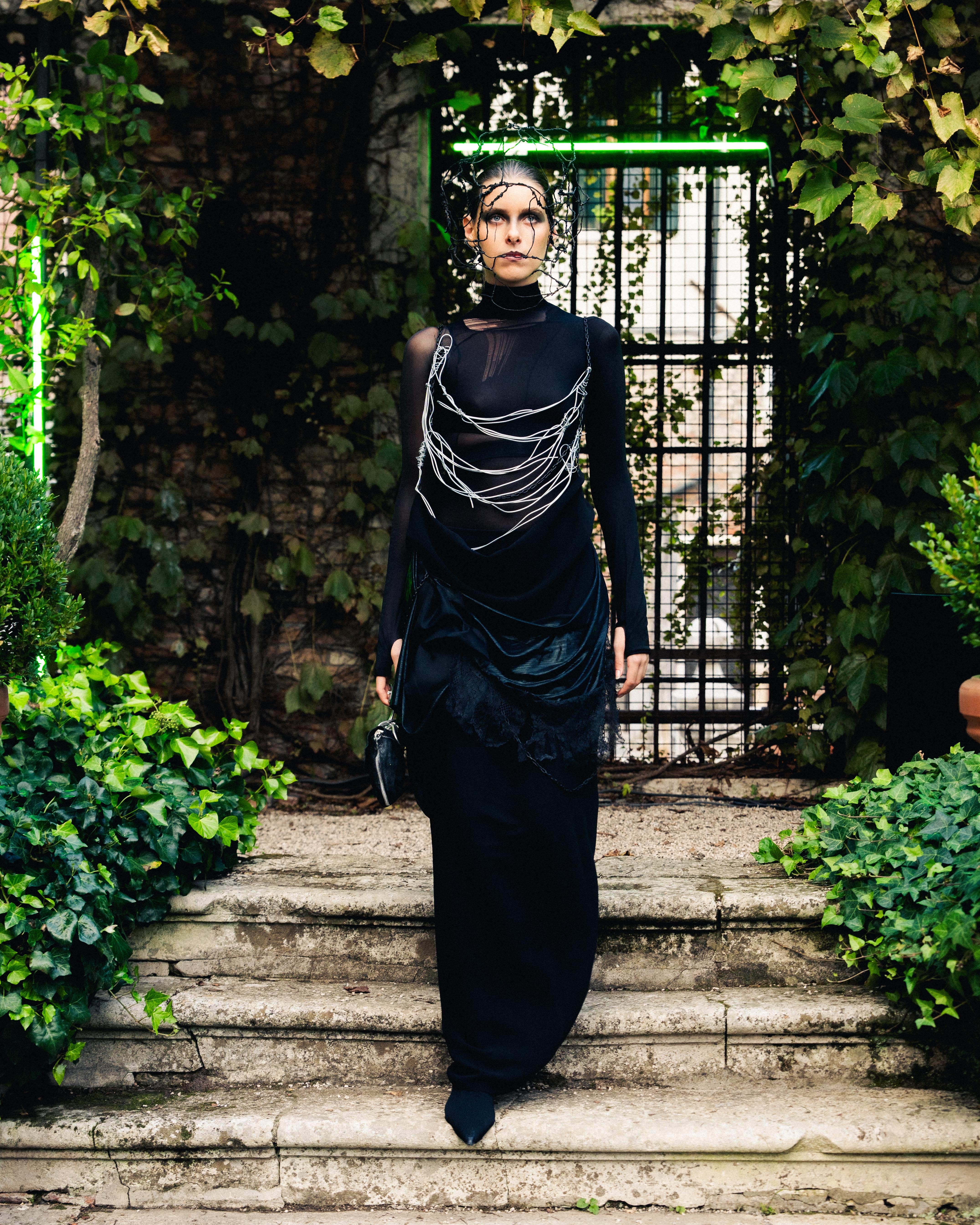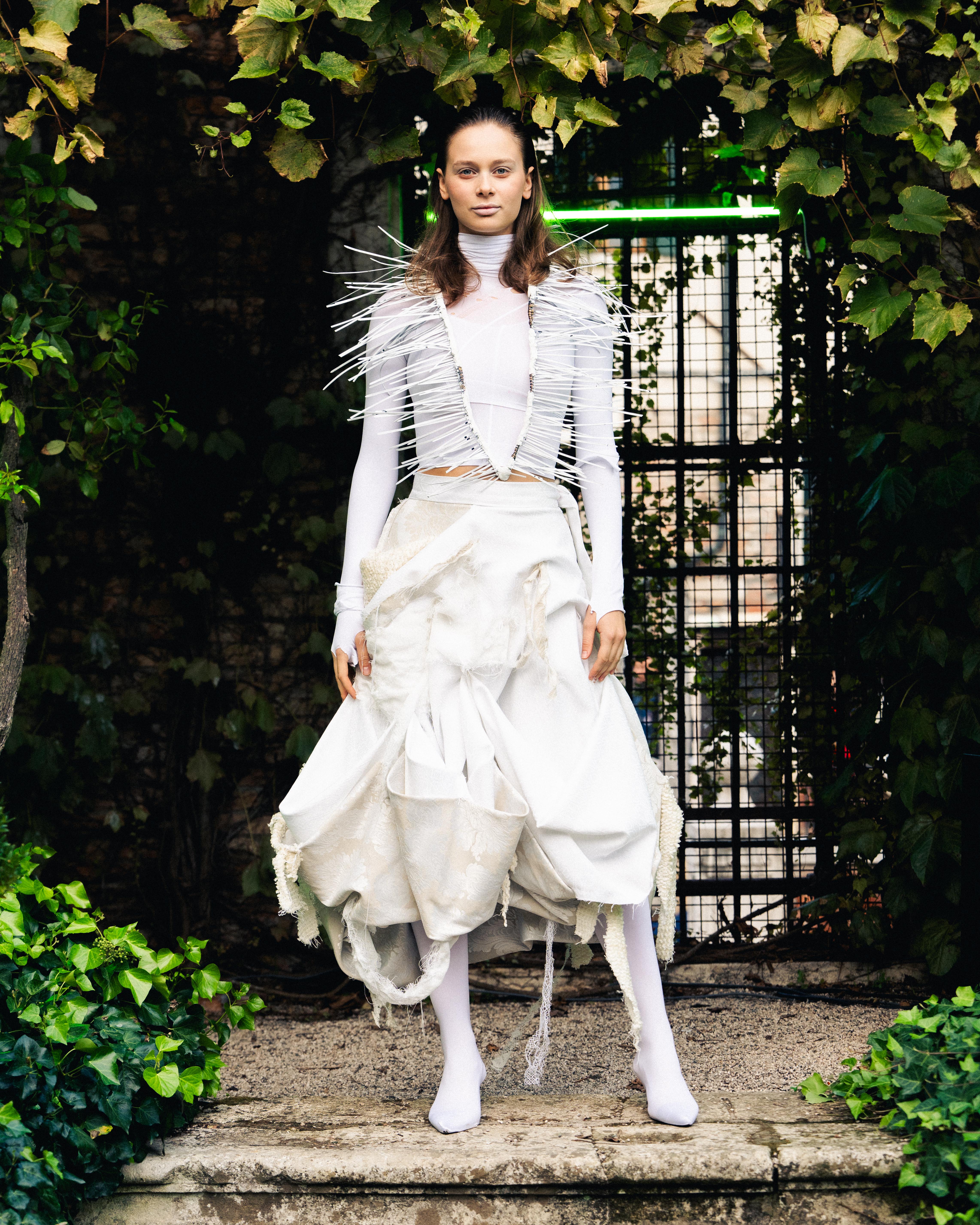 Things change, transform, evolve.And man too, silently, evolves.From the ashes of Homo Sapiens, a new species reigns over the world. The vertical rise of technologies, the development of artificial embryos, controlled birth, and AI have all contributed to the transition from Homo Sapiens to God.Homo Deus stands at the center of the universe, aware of his authority over the cosmos, master of technologies—but no longer of himself.Life, death, and rebirth are bound together by a circular design, inevitably leading them to collaborate in an ancestral dance.Through paradoxical material associations, fabrics and forms no longer carry a conventional code of dress, but serve as a communicative vehicle, with metaphors retracing human history.The return of face paintings, ornaments, new written languages, and biomaterials suggests new visions of a world that has sheltered us since we were animals.The awareness of the life cycle, of a new beginning destined to repeat itself forever.